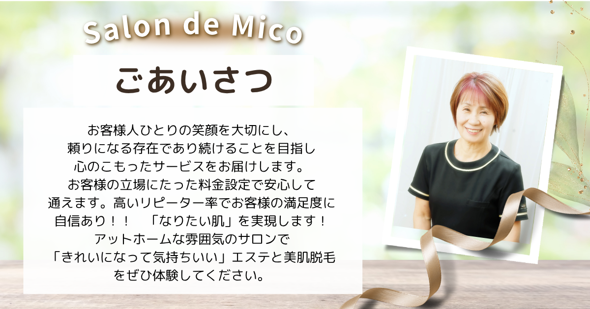 Salon de micoは、あなたが自信を持って輝く未来を応援します。年齢を重ねるごとに増えるお悩みを、私たちと一緒に解決し、心身ともに満たされる日々を手に入れましょう。あなたの『なりたい』を叶えるための第一歩を、今、踏み出してください。